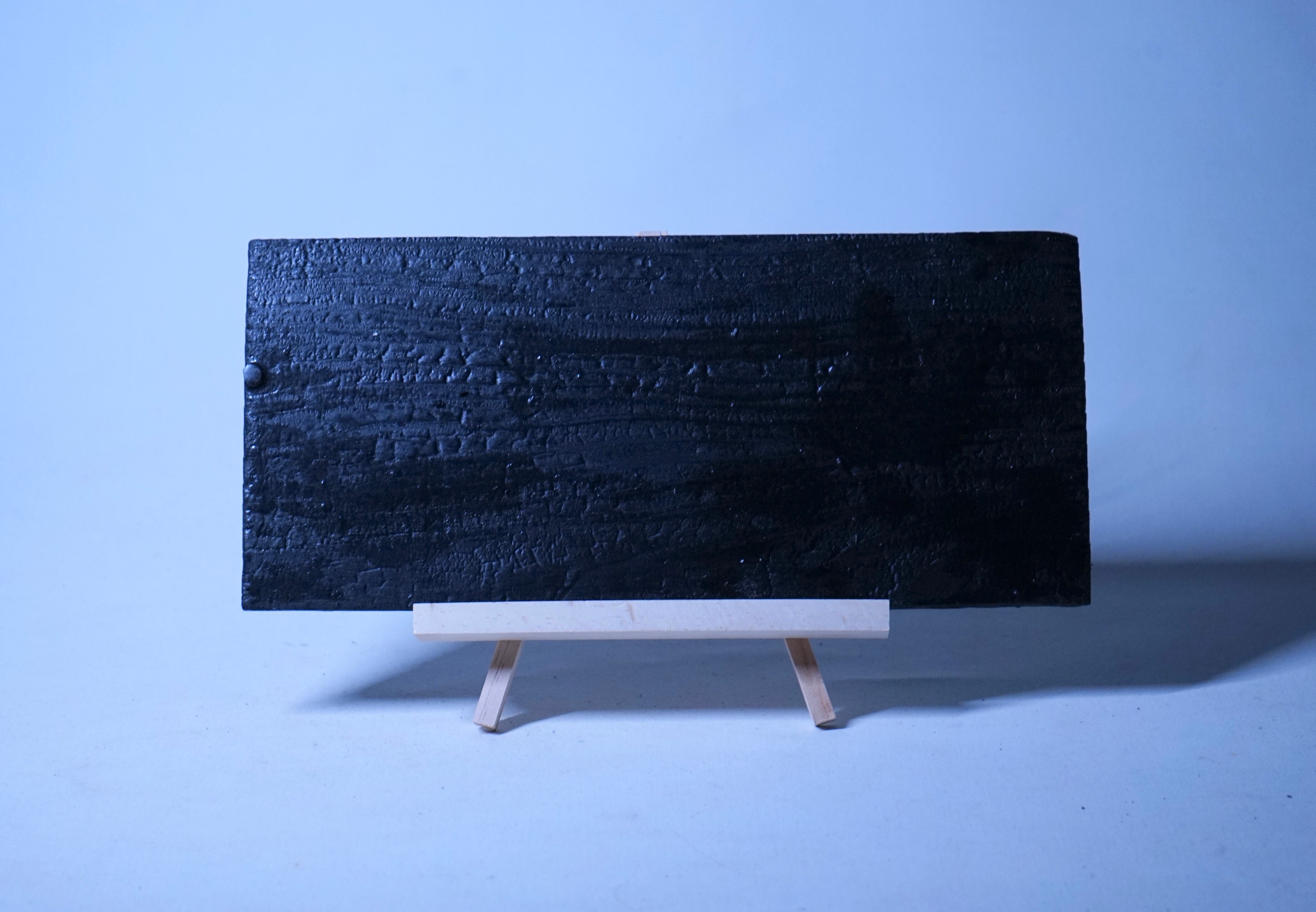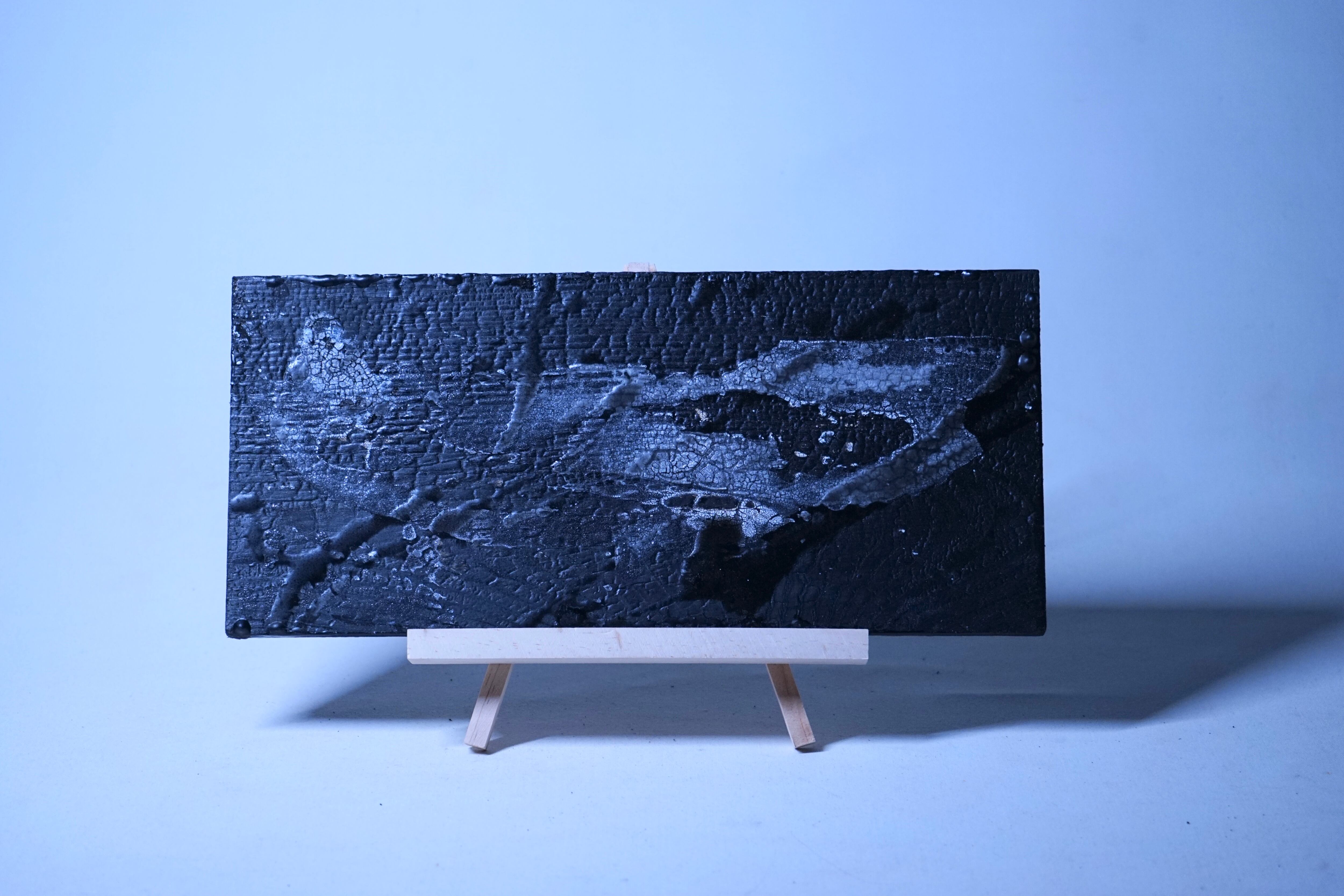 表面を炭化するほど焼き上げ、炭化部分に resin(エポキシ樹脂)を流し込み硬化させました。